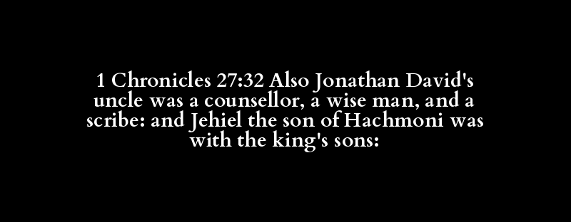 1 Chronicles 27:32 Also Jonathan David's uncle was a counsellor, a wise man, and a scribe: and Jehiel the son of Hachmoni was with the king's sons: