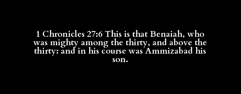 1 Chronicles 27:6 This is that Benaiah, who was mighty among the thirty, and above the thirty: and in his course was Ammizabad his son.