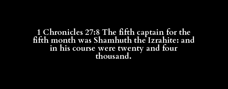 1 Chronicles 27:8 The fifth captain for the fifth month was Shamhuth the Izrahite: and in his course were twenty and four thousand.