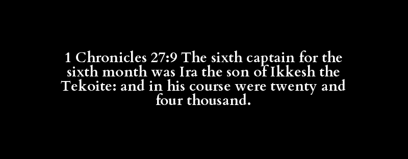 1 Chronicles 27:9 The sixth captain for the sixth month was Ira the son of Ikkesh the Tekoite: and in his course were twenty and four thousand.