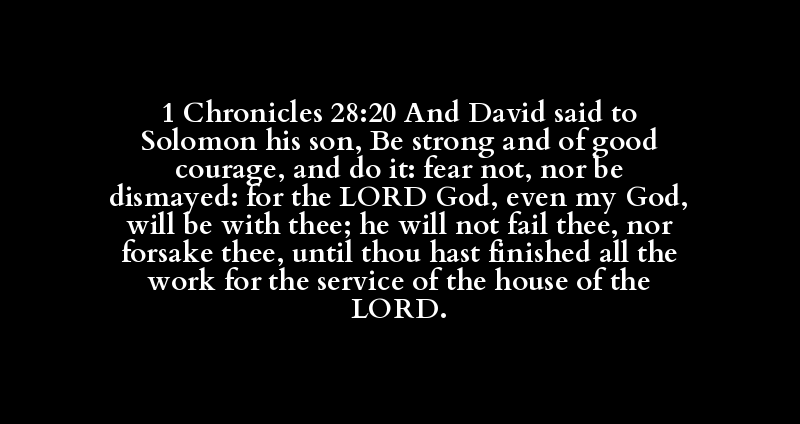 1 Chronicles 28:20 And David said to Solomon his son, Be strong and of good courage, and do it: fear not, nor be dismayed: for the LORD God, even my God, will be with thee; he will not fail thee, nor forsake thee, until thou hast finished all the work for the service of the house of the LORD.