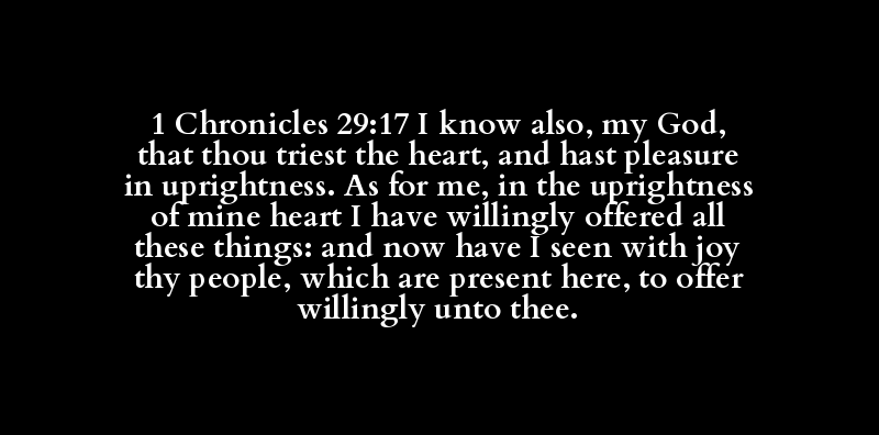 1 Chronicles 29:17 I know also, my God, that thou triest the heart, and hast pleasure in uprightness. As for me, in the uprightness of mine heart I have willingly offered all these things: and now have I seen with joy thy people, which are present here, to offer willingly unto thee.