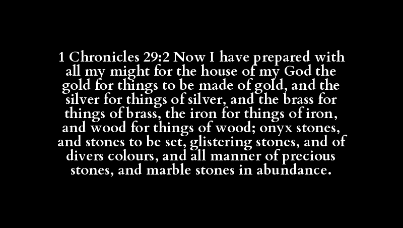 1 Chronicles 29:2 Now I have prepared with all my might for the house of my God the gold for things to be made of gold, and the silver for things of silver, and the brass for things of brass, the iron for things of iron, and wood for things of wood; onyx stones, and stones to be set, glistering stones, and of divers colours, and all manner of precious stones, and marble stones in abundance.