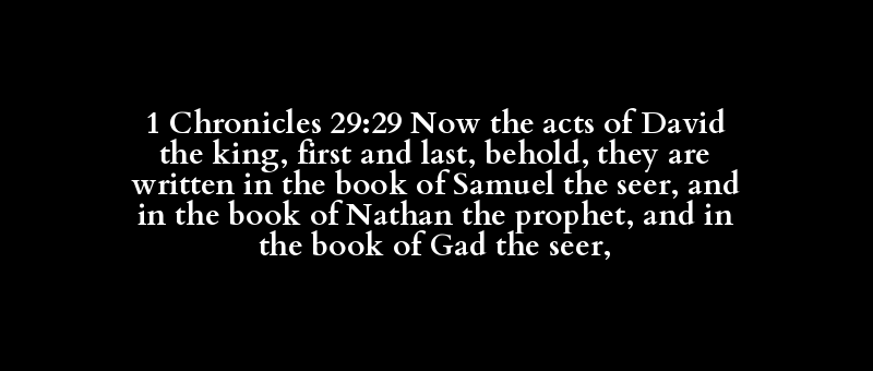 1 Chronicles 29:29 Now the acts of David the king, first and last, behold, they are written in the book of Samuel the seer, and in the book of Nathan the prophet, and in the book of Gad the seer,