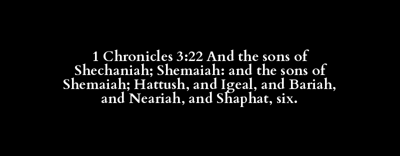 1 Chronicles 3:22 And the sons of Shechaniah; Shemaiah: and the sons of Shemaiah; Hattush, and Igeal, and Bariah, and Neariah, and Shaphat, six.