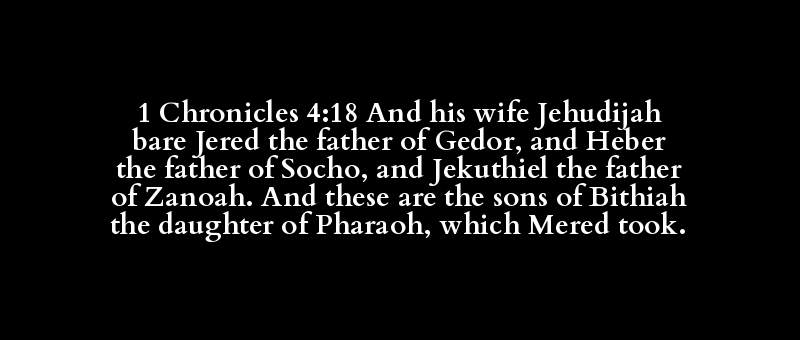 1 Chronicles 4:18 And his wife Jehudijah bare Jered the father of Gedor, and Heber the father of Socho, and Jekuthiel the father of Zanoah. And these are the sons of Bithiah the daughter of Pharaoh, which Mered took.