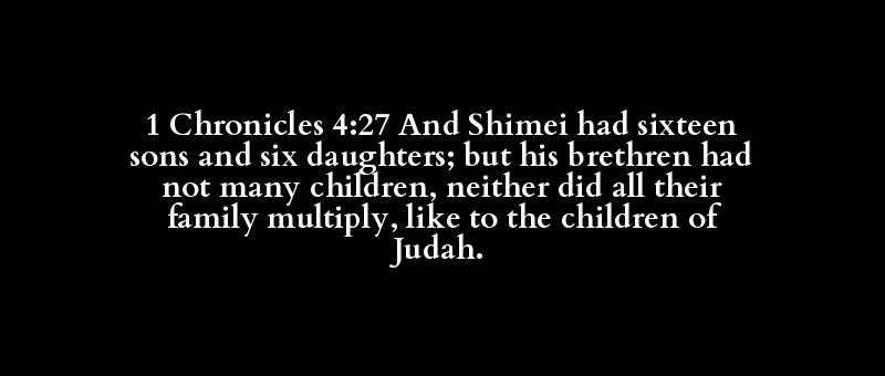 1 Chronicles 4:27 And Shimei had sixteen sons and six daughters; but his brethren had not many children, neither did all their family multiply, like to the children of Judah.
