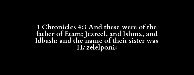 1 Chronicles 4:3 And these were of the father of Etam; Jezreel, and Ishma, and Idbash: and the name of their sister was Hazelelponi: