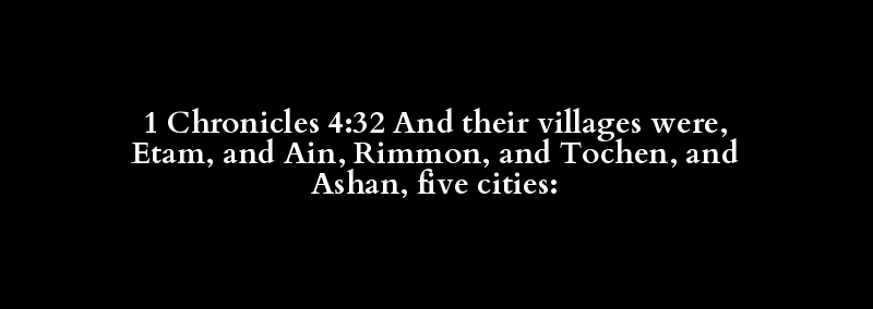 1 Chronicles 4:32 And their villages were, Etam, and Ain, Rimmon, and Tochen, and Ashan, five cities: