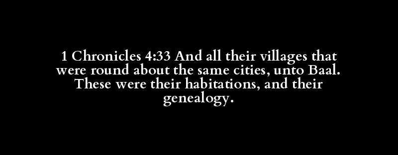 1 Chronicles 4:33 And all their villages that were round about the same cities, unto Baal. These were their habitations, and their genealogy.