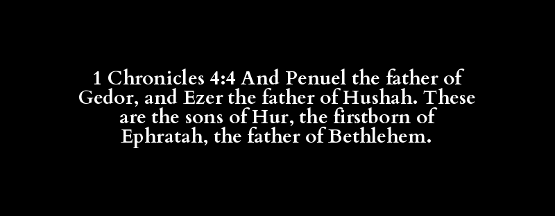 1 Chronicles 4:4 And Penuel the father of Gedor, and Ezer the father of Hushah. These are the sons of Hur, the firstborn of Ephratah, the father of Bethlehem.