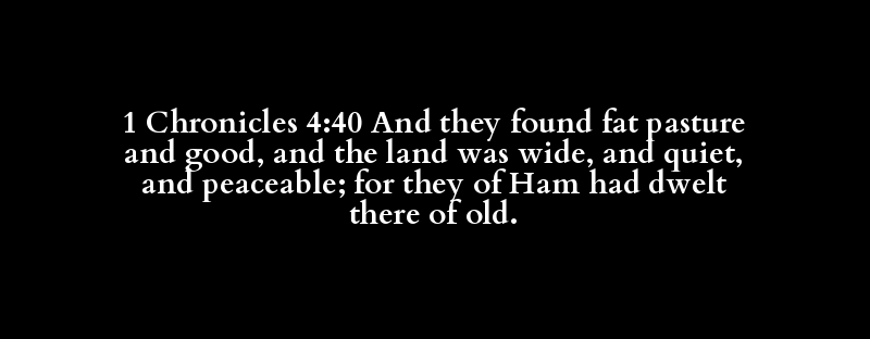 1 Chronicles 4:40 And they found fat pasture and good, and the land was wide, and quiet, and peaceable; for they of Ham had dwelt there of old.