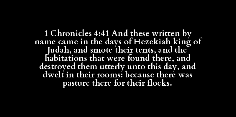 1 Chronicles 4:41 And these written by name came in the days of Hezekiah king of Judah, and smote their tents, and the habitations that were found there, and destroyed them utterly unto this day, and dwelt in their rooms: because there was pasture there for their flocks.