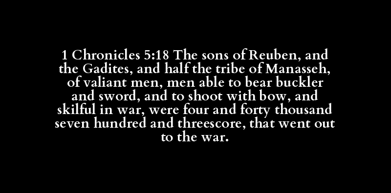 1 Chronicles 5:18 The sons of Reuben, and the Gadites, and half the tribe of Manasseh, of valiant men, men able to bear buckler and sword, and to shoot with bow, and skilful in war, were four and forty thousand seven hundred and threescore, that went out to the war.