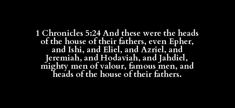 1 Chronicles 5:24 And these were the heads of the house of their fathers, even Epher, and Ishi, and Eliel, and Azriel, and Jeremiah, and Hodaviah, and Jahdiel, mighty men of valour, famous men, and heads of the house of their fathers.