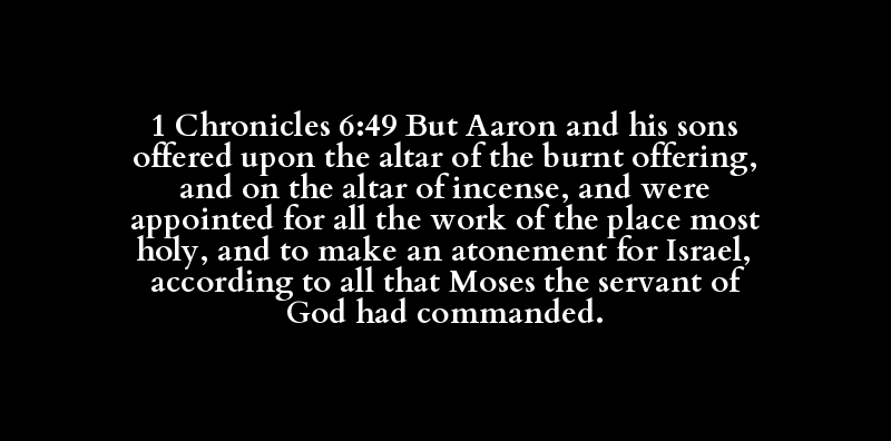 1 Chronicles 6:49 But Aaron and his sons offered upon the altar of the burnt offering, and on the altar of incense, and were appointed for all the work of the place most holy, and to make an atonement for Israel, according to all that Moses the servant of God had commanded.