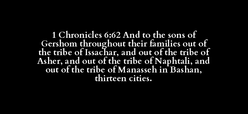1 Chronicles 6:62 And to the sons of Gershom throughout their families out of the tribe of Issachar, and out of the tribe of Asher, and out of the tribe of Naphtali, and out of the tribe of Manasseh in Bashan, thirteen cities.