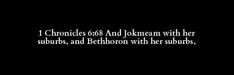 1 Chronicles 6:68 And Jokmeam with her suburbs, and Bethhoron with her suburbs,