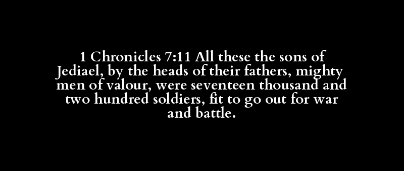 1 Chronicles 7:11 All these the sons of Jediael, by the heads of their fathers, mighty men of valour, were seventeen thousand and two hundred soldiers, fit to go out for war and battle.