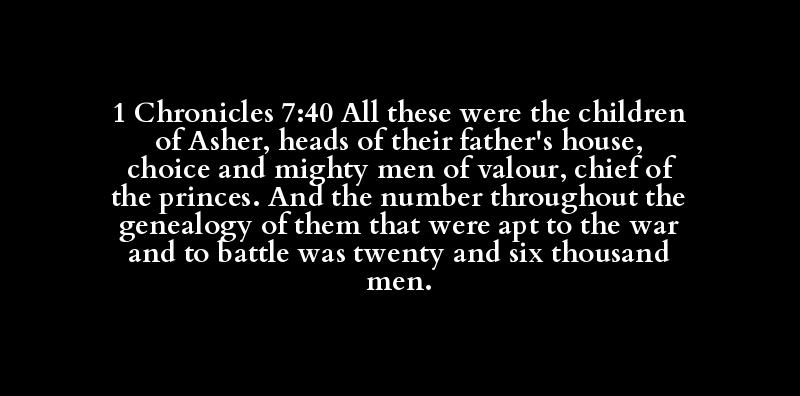 1 Chronicles 7:40 All these were the children of Asher, heads of their father's house, choice and mighty men of valour, chief of the princes. And the number throughout the genealogy of them that were apt to the war and to battle was twenty and six thousand men.