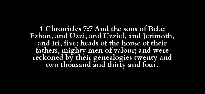 1 Chronicles 7:7 And the sons of Bela; Ezbon, and Uzzi, and Uzziel, and Jerimoth, and Iri, five; heads of the house of their fathers, mighty men of valour; and were reckoned by their genealogies twenty and two thousand and thirty and four.