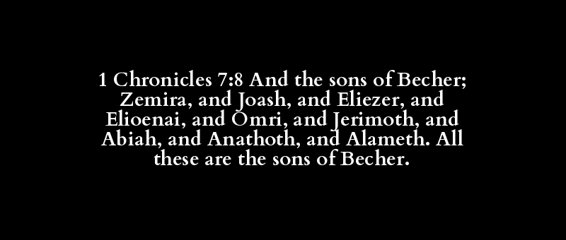1 Chronicles 7:8 And the sons of Becher; Zemira, and Joash, and Eliezer, and Elioenai, and Omri, and Jerimoth, and Abiah, and Anathoth, and Alameth. All these are the sons of Becher.