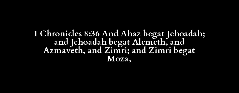 1 Chronicles 8:36 And Ahaz begat Jehoadah; and Jehoadah begat Alemeth, and Azmaveth, and Zimri; and Zimri begat Moza,