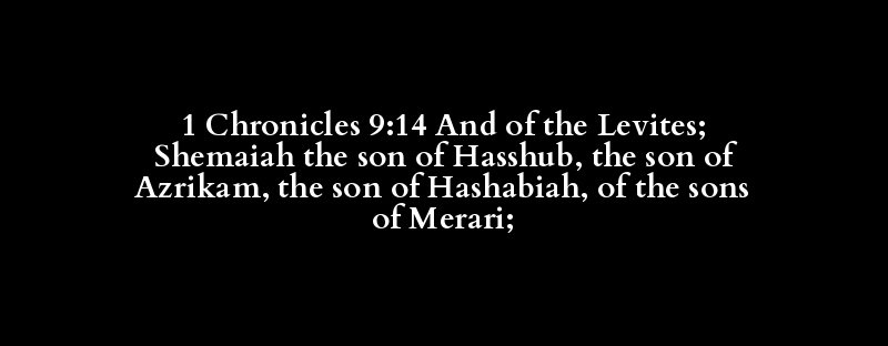 1 Chronicles 9:14 And of the Levites; Shemaiah the son of Hasshub, the son of Azrikam, the son of Hashabiah, of the sons of Merari;