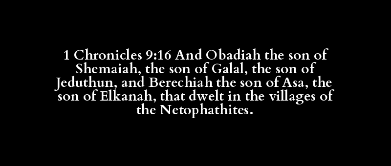 1 Chronicles 9:16 And Obadiah the son of Shemaiah, the son of Galal, the son of Jeduthun, and Berechiah the son of Asa, the son of Elkanah, that dwelt in the villages of the Netophathites.