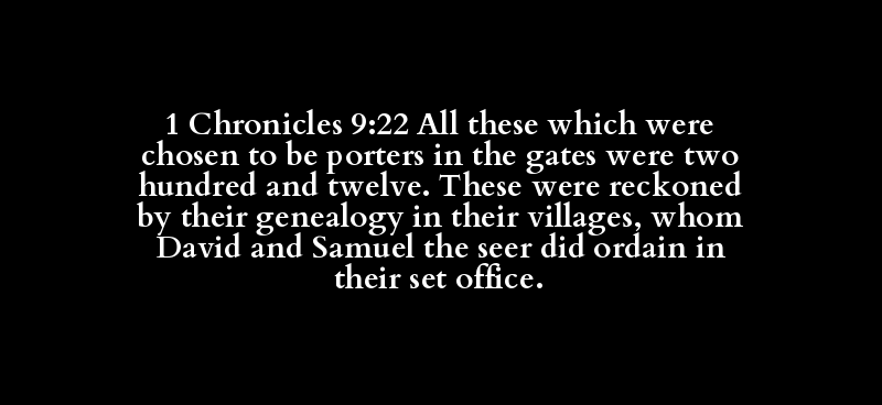 1 Chronicles 9:22 All these which were chosen to be porters in the gates were two hundred and twelve. These were reckoned by their genealogy in their villages, whom David and Samuel the seer did ordain in their set office.