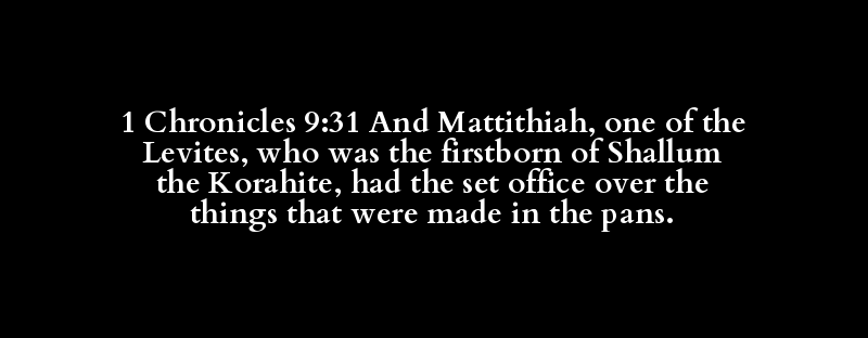 1 Chronicles 9:31 And Mattithiah, one of the Levites, who was the firstborn of Shallum the Korahite, had the set office over the things that were made in the pans.