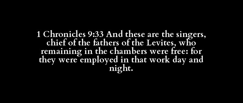 1 Chronicles 9:33 And these are the singers, chief of the fathers of the Levites, who remaining in the chambers were free: for they were employed in that work day and night.