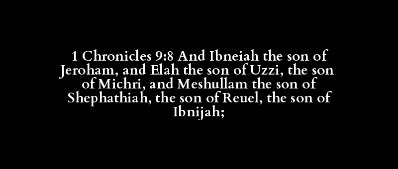 1 Chronicles 9:8 And Ibneiah the son of Jeroham, and Elah the son of Uzzi, the son of Michri, and Meshullam the son of Shephathiah, the son of Reuel, the son of Ibnijah;