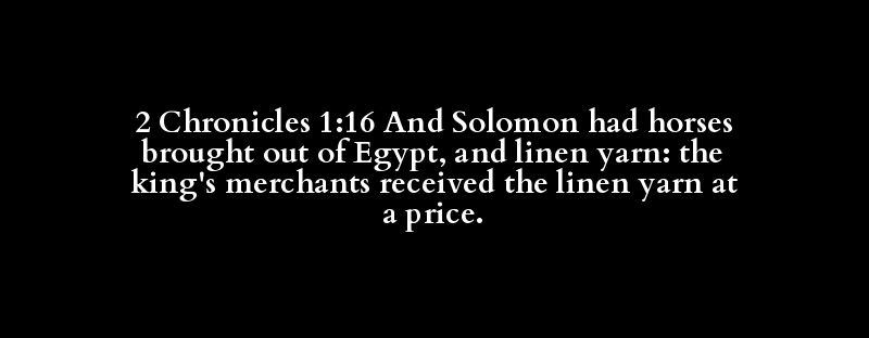 2 Chronicles 1:16 And Solomon had horses brought out of Egypt, and linen yarn: the king's merchants received the linen yarn at a price.