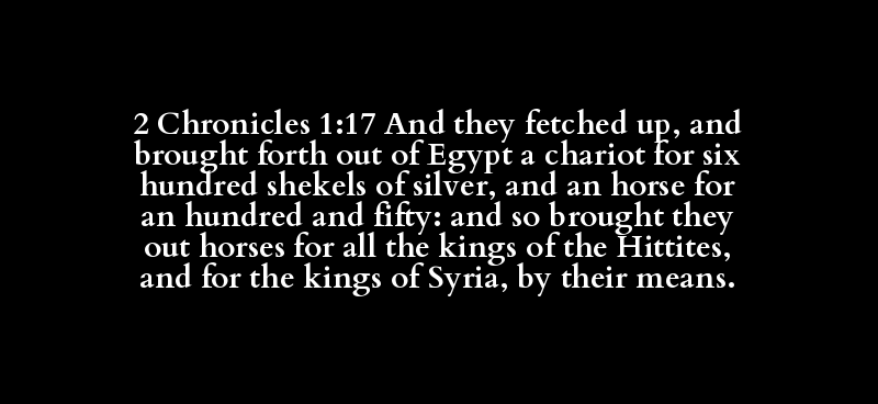 2 Chronicles 1:17 And they fetched up, and brought forth out of Egypt a chariot for six hundred shekels of silver, and an horse for an hundred and fifty: and so brought they out horses for all the kings of the Hittites, and for the kings of Syria, by their means.