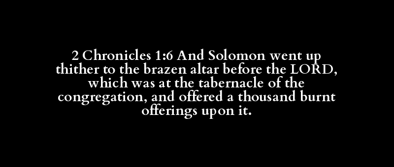 2 Chronicles 1:6 And Solomon went up thither to the brazen altar before the LORD, which was at the tabernacle of the congregation, and offered a thousand burnt offerings upon it.