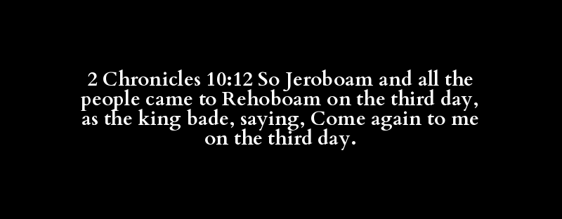 2 Chronicles 10:12 So Jeroboam and all the people came to Rehoboam on the third day, as the king bade, saying, Come again to me on the third day.