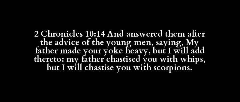 2 Chronicles 10:14 And answered them after the advice of the young men, saying, My father made your yoke heavy, but I will add thereto: my father chastised you with whips, but I will chastise you with scorpions.