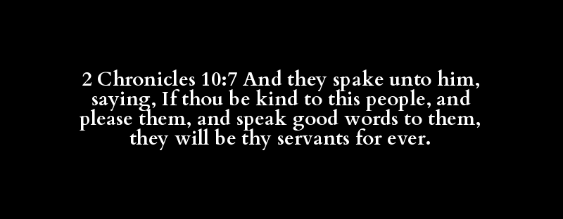 2 Chronicles 10:7 And they spake unto him, saying, If thou be kind to this people, and please them, and speak good words to them, they will be thy servants for ever.