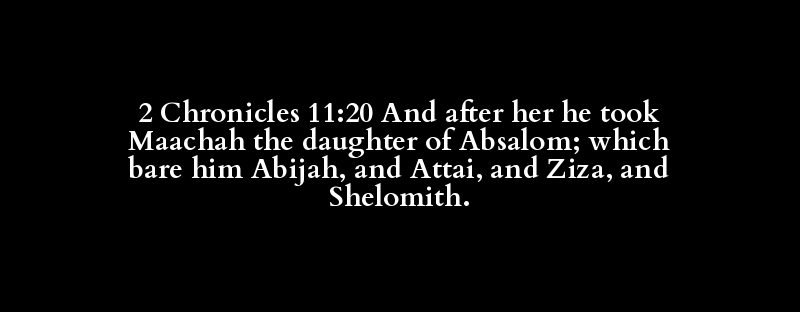 2 Chronicles 11:20 And after her he took Maachah the daughter of Absalom; which bare him Abijah, and Attai, and Ziza, and Shelomith.