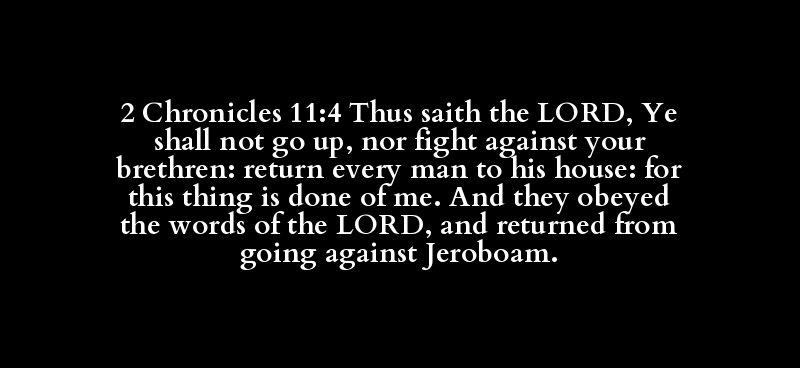 2 Chronicles 11:4 Thus saith the LORD, Ye shall not go up, nor fight against your brethren: return every man to his house: for this thing is done of me. And they obeyed the words of the LORD, and returned from going against Jeroboam.