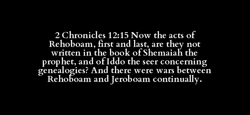 2 Chronicles 12:15 Now the acts of Rehoboam, first and last, are they not written in the book of Shemaiah the prophet, and of Iddo the seer concerning genealogies? And there were wars between Rehoboam and Jeroboam continually.