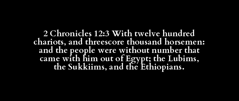 2 Chronicles 12:3 With twelve hundred chariots, and threescore thousand horsemen: and the people were without number that came with him out of Egypt; the Lubims, the Sukkiims, and the Ethiopians.