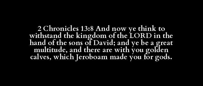 2 Chronicles 13:8 And now ye think to withstand the kingdom of the LORD in the hand of the sons of David; and ye be a great multitude, and there are with you golden calves, which Jeroboam made you for gods.