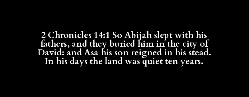 2 Chronicles 14:1 So Abijah slept with his fathers, and they buried him in the city of David: and Asa his son reigned in his stead. In his days the land was quiet ten years.