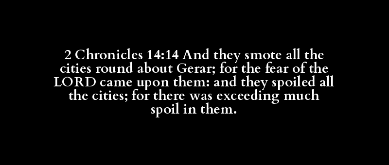 2 Chronicles 14:14 And they smote all the cities round about Gerar; for the fear of the LORD came upon them: and they spoiled all the cities; for there was exceeding much spoil in them.