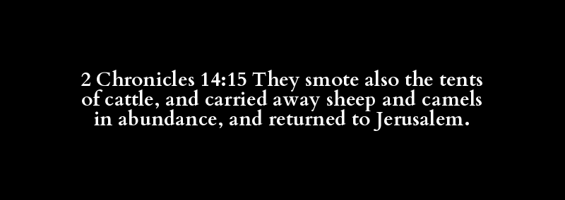2 Chronicles 14:15 They smote also the tents of cattle, and carried away sheep and camels in abundance, and returned to Jerusalem.