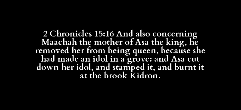 2 Chronicles 15:16 And also concerning Maachah the mother of Asa the king, he removed her from being queen, because she had made an idol in a grove: and Asa cut down her idol, and stamped it, and burnt it at the brook Kidron.