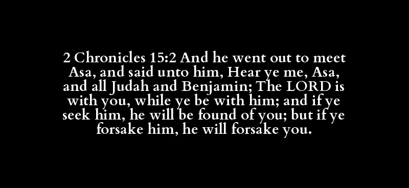 2 Chronicles 15:2 And he went out to meet Asa, and said unto him, Hear ye me, Asa, and all Judah and Benjamin; The LORD is with you, while ye be with him; and if ye seek him, he will be found of you; but if ye forsake him, he will forsake you.