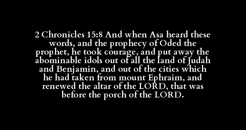 2 Chronicles 15:8 And when Asa heard these words, and the prophecy of Oded the prophet, he took courage, and put away the abominable idols out of all the land of Judah and Benjamin, and out of the cities which he had taken from mount Ephraim, and renewed the altar of the LORD, that was before the porch of the LORD.